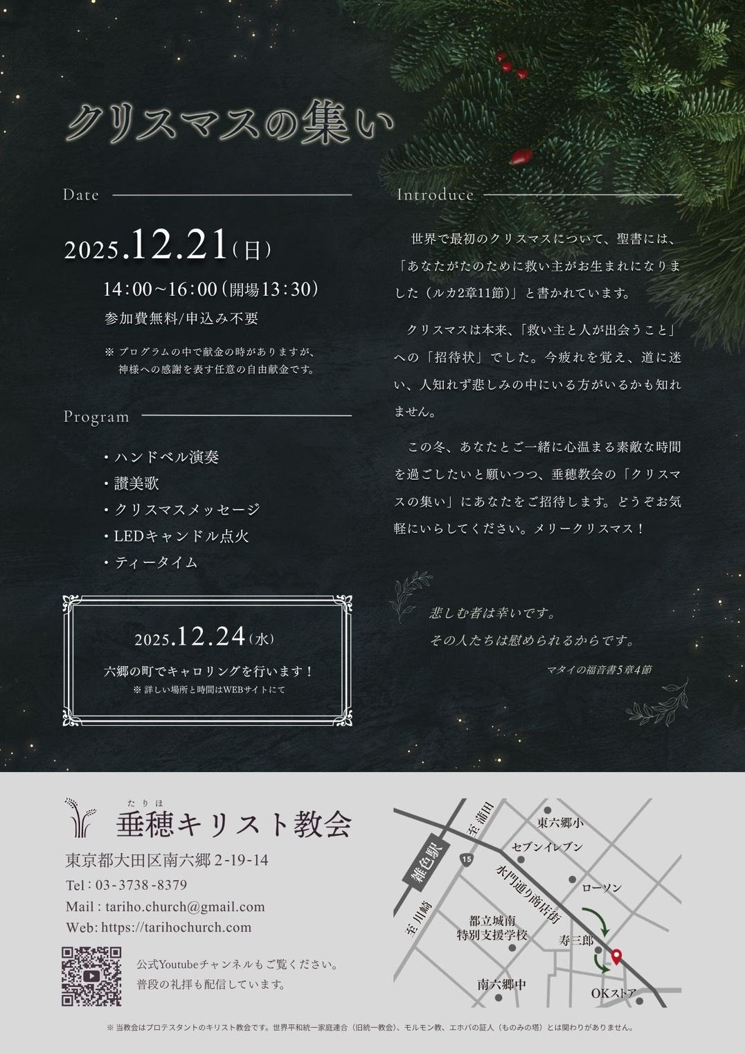 今疲れを覚え、道に迷い、人知れず悲しみの中にいる方がいるかも知れません。この冬、あなたとご一緒に心温まる素敵な時間を過ごしたいと願いつつ、垂穂教会の「クリスマスの集い」にあなたをご招待します。どうぞお気軽にいらしてください。メリークリスマス!
